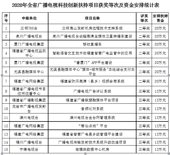 二、安排2020年全省广播电视科技创新奖励资金
