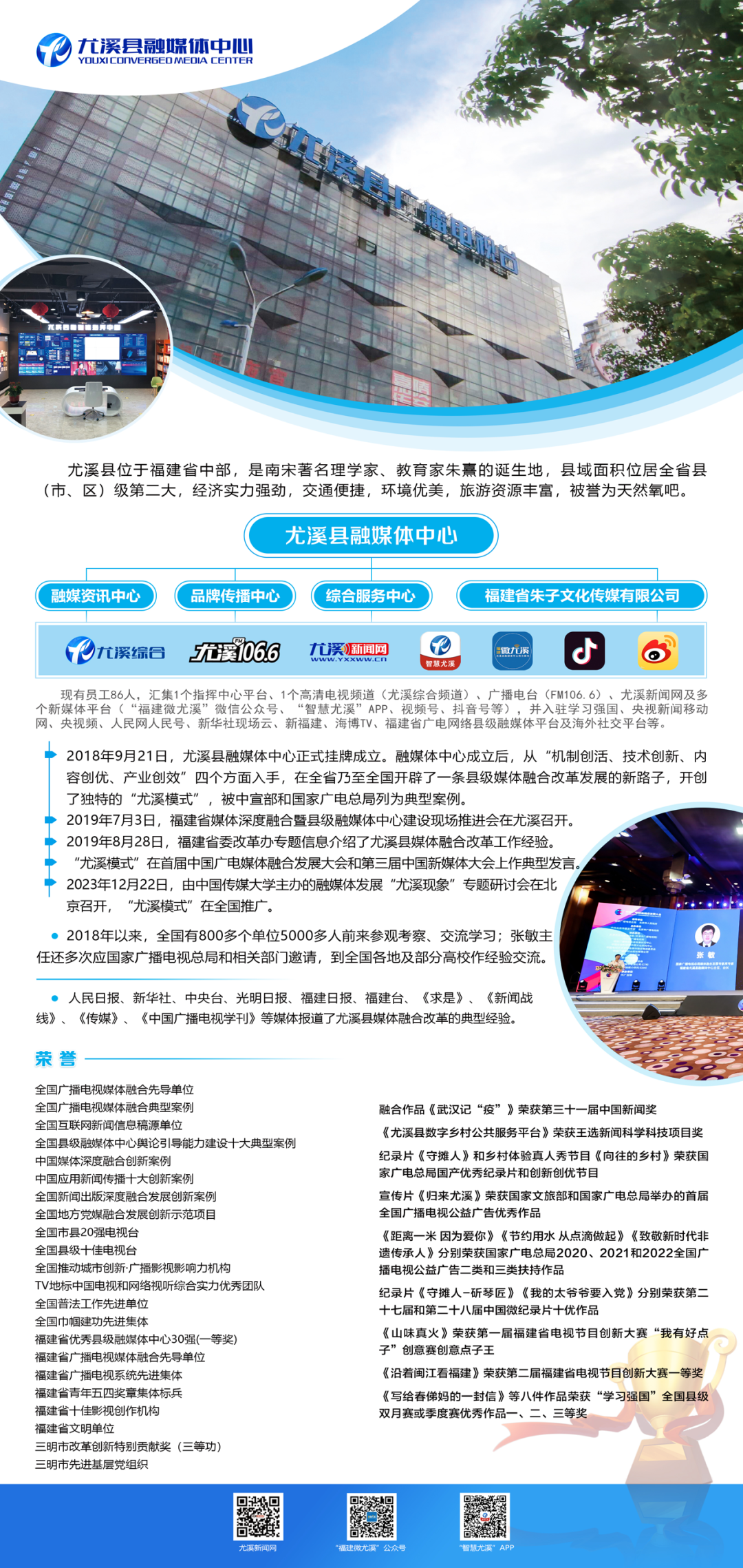 尤溪县融媒体中心下设三大分中心(融媒资讯、品牌传播、综合服务),并全权经营管理一家国有企业(福建省朱子文化传媒有限公司),现有员工88人。