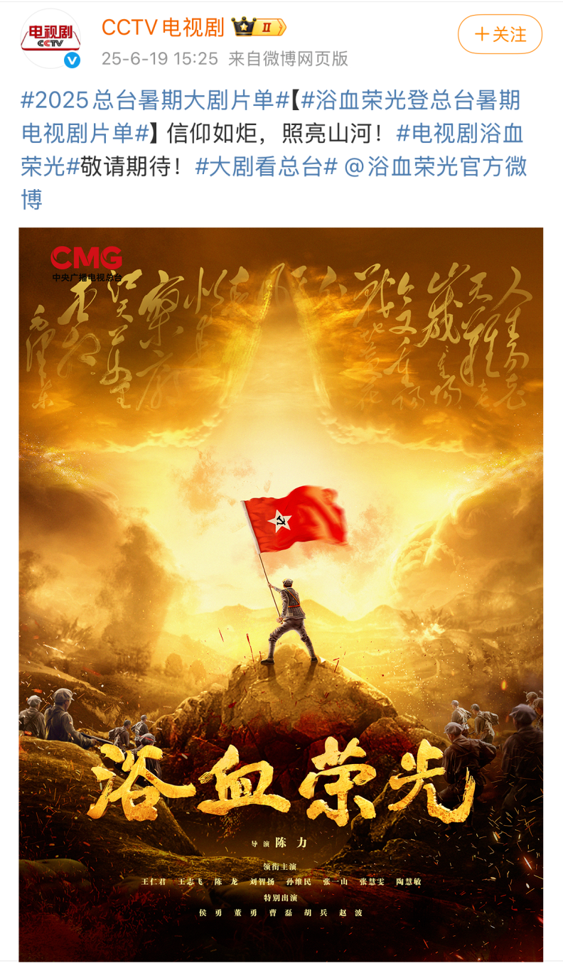 6月19日,中央广播电视总台2025CMG暑期视听嘉年华在京举行,发布2025总台暑期大剧片单。由NG28南宫 申报立项,福建省委宣传部、NG28 等联合摄制,福建电影制片厂、八一电影制片厂等联合出品的重大革命历史题材电视剧《浴血荣光》上榜待播,敬请期待!